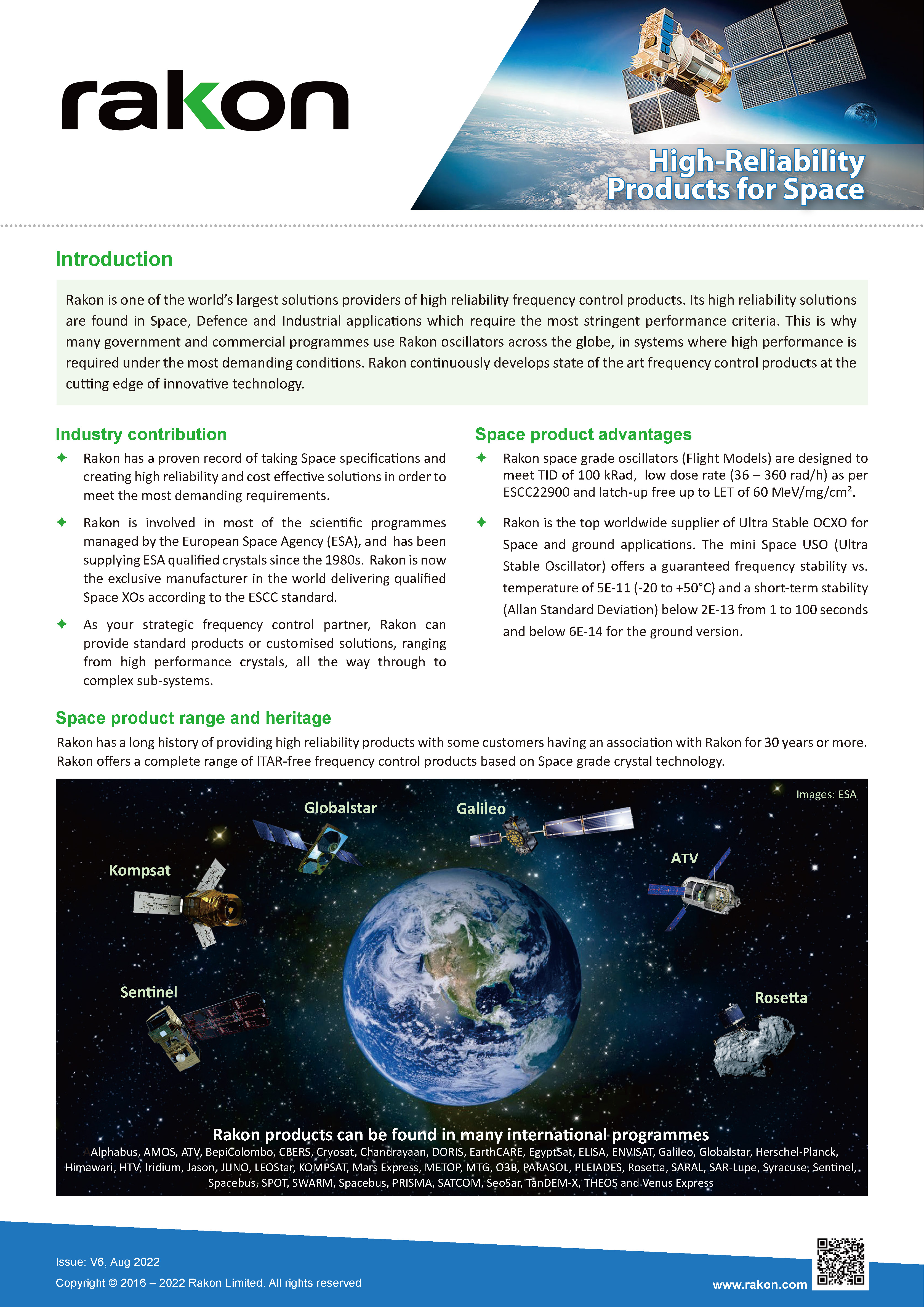 Introducing crystal products used in many international satellite projects. RAKON's crystal devices, which comply with radiation and G sensitivity, contribute to the global space business.