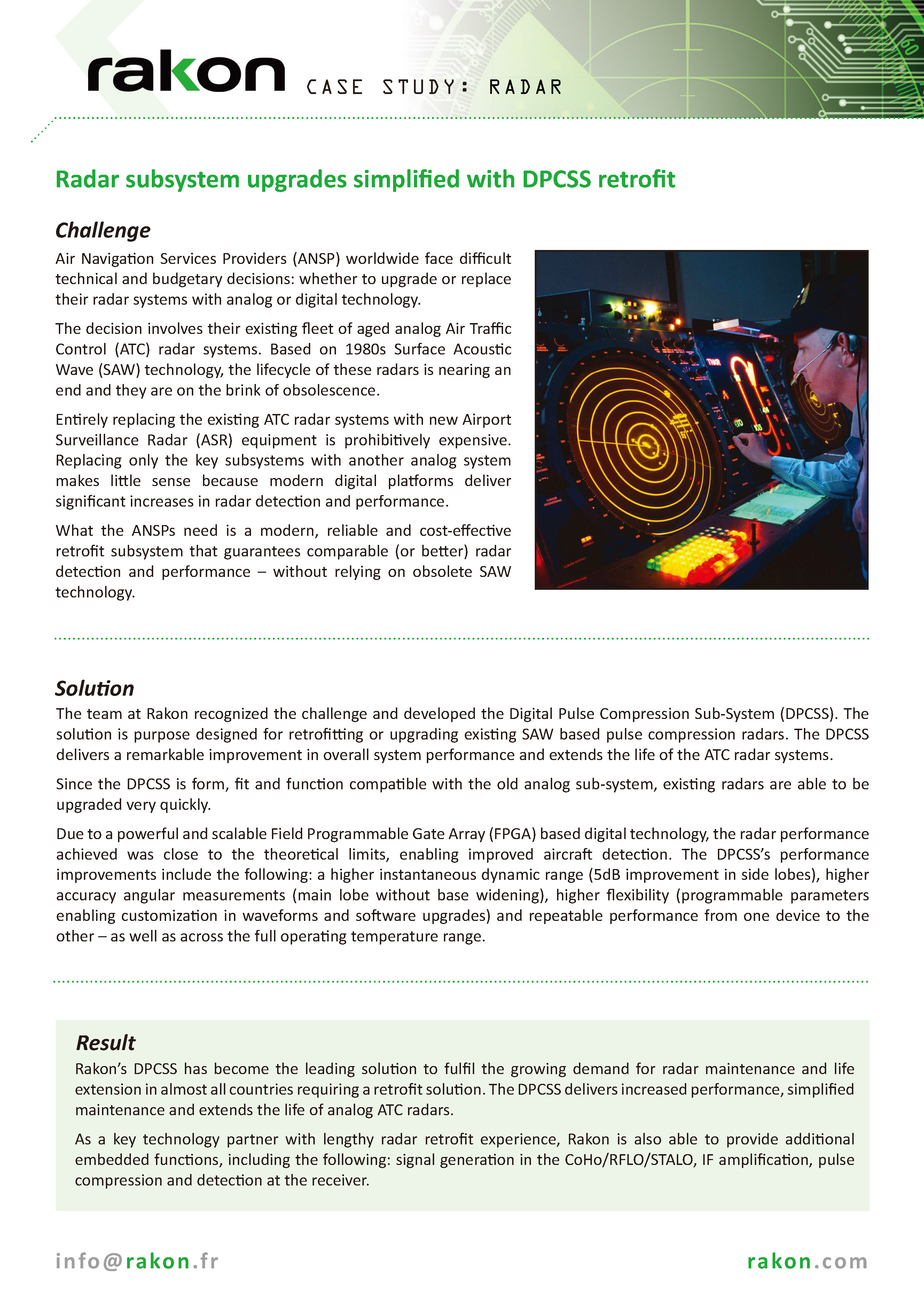 Digital Pulse Compression Subsystem (DPCSS) solution is designed to retrofit or upgrade existing pulse-compression radars. DPCSS significantly improves overall system performance and extends the life of ATC radar systems.