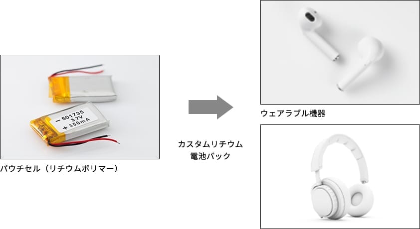 ウェアラブル機器など小型/軽量機器に内包するのに最適です。パウチセルは、約25mAh~1,550mAhのセルをご用意しています。機器に埋め込んで使うイメージです。