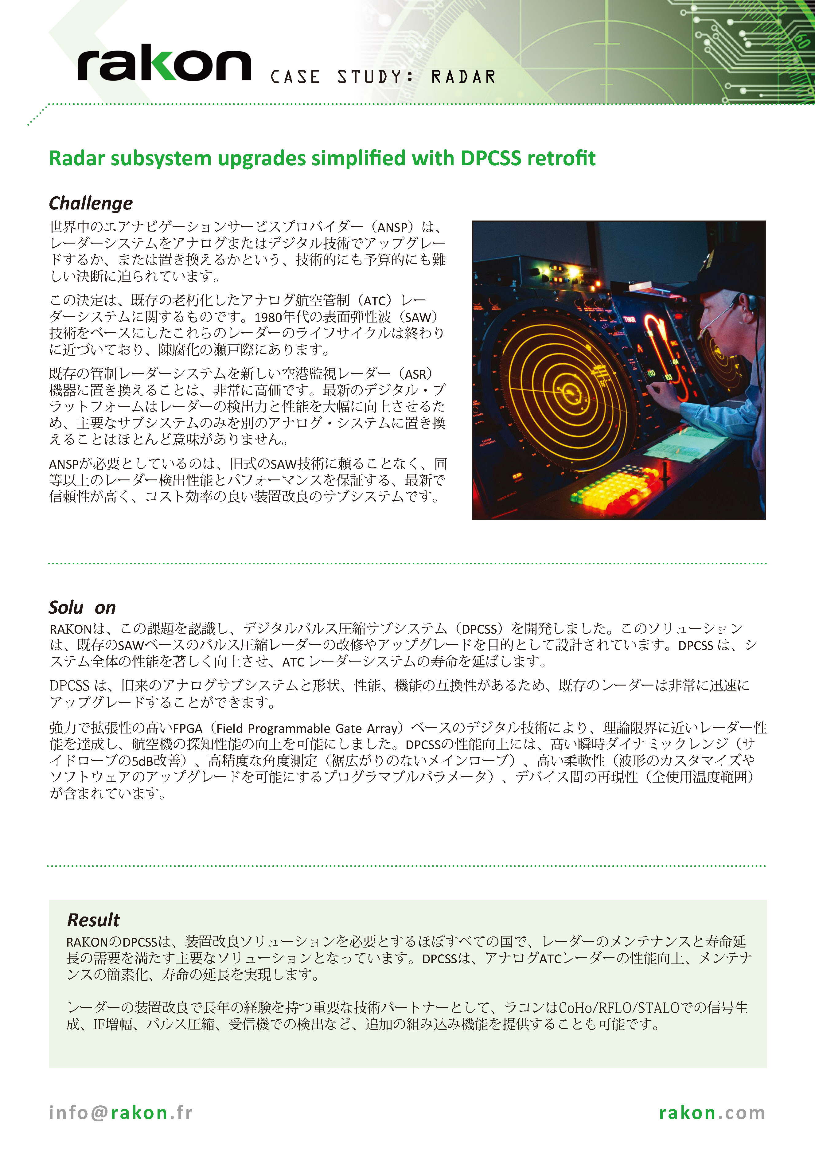 開発したデジタルパルス圧縮サブシステム(DPCSS)のソリューション は、既存のパルス圧縮レーダーの改修やアップグレードを目的として設計されています。DPCSS は、システム全体の性能を著しく向上させ、ATC レーダーシステムの寿命を延ばします。